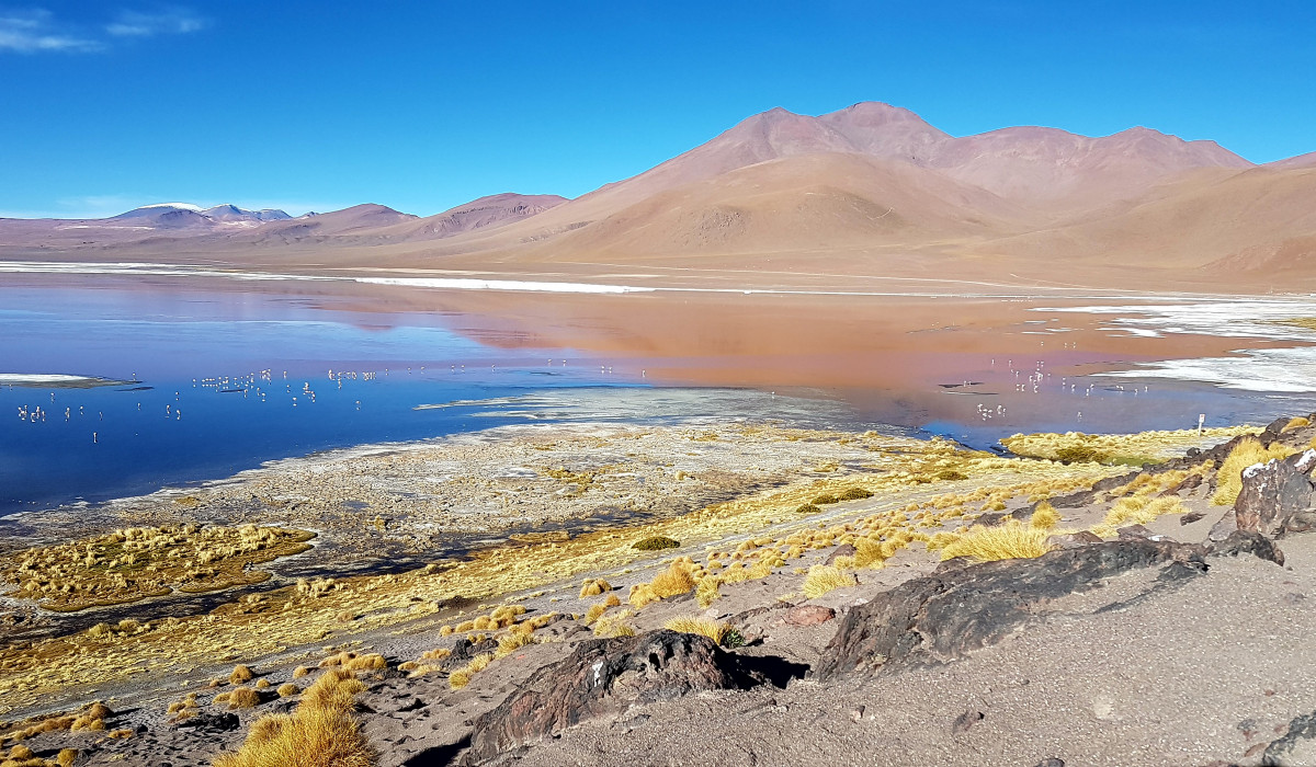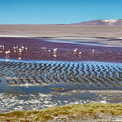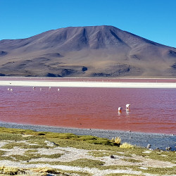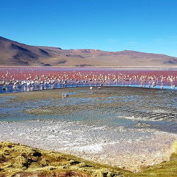 This is the most beautiful place on earth, I’m sure of it. When I stepped out of the Landrover, it seemed both silent yet full of sound all at the same time; the silence of the early morning desert and the noise of the flamingos perennial cooing. Unlike the jagged edges of Patagonia, everything here seemed soft, muted. Patterns of algae formed sweeping curves on the lake; the mountains seemed soft like dollops of coffee ice cream. The layers of colours were perfectly harmonious: soft, sandy browns, mustard yellows, rich olives, the vivid rusty reds of the water.