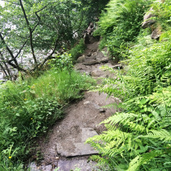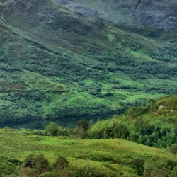 At some point the path becomes very rocky – this is certainly the most challenging part of the trail. As I discovered, scrambling over boulders and shimmying down rock-face is enormously fun. My pack provided further challenge as the weight pulled me unduly one way or another; it would be easy to lose balance and find yourself tumbling down a gully or into the loch itself. At one point a Swiss man did indeed fall above me at a point where the path split into two levels. His rucksack and the top of his head were about a foot above my eye level and he appeared to rolling further over in slow motion. I stuck my arm out to try and prevent him from tipping over the edge and on top of me but luckily he stopped there, and not long after regained his composure and got up; all was fine – the next time I bumped into him was in the whiskey shop in Fort William.