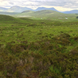 And so to Rannoch Moor, a wild expanse of over 50 square miles both revered and feared for its savage terrain, and one of my inspirations for coming to Scotland. It was a fabulous day of vigorous wide-open skies and dancing clouds occasionally exposing patches of blue or a shafts of sunlight, and sudden, short, showers of warm rain. There is a fabulous palette of colours knitted into the landscape: Purple Heathers, red peaty earth, the white fluffy tops of windswept cotton grass. The moor is pocked with silvery pools of water and an intricate web of streams. Distant mountains veiled in blue mist roll out creating a sense of endless depth to the landscape – it is beautifully wild. Robert McFarland writes in The Wild Places: ‘Open spaces bring something to mind which is difficult to express, but unmistakable to experience – and Rannoch is among the greatest of those spaces’.